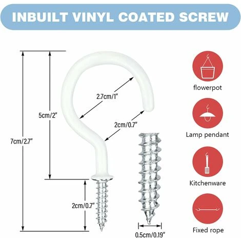 Large gamme d’applications: les vis crochet peuvent être utilisés pour les clés suspendues à l’intérieur, les cintres, les tasses, l’éclairage et les pots de fleurs suspendus à l’extérieur, les paniers suspendus, etc., pour économiser et utiliser pleinement l’espace pour répondre à vos divers besoins.
