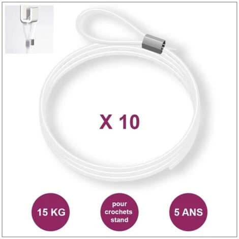 Lot de 10 câbles perlon Ă boucle de 100 cm. Ce câble perlon transparent d’un diamètre de 2mm peut supporter une charge jusqu’Ă 15 kg. Les câbles Ă boucle peuvent ĂŞtre utilisĂ©s avec les crochets en S et les crochets pour panneau de stand.