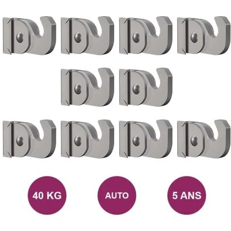 - Ce lot de 10 crochets autobloquants doit ĂŞtre combiner avec des tiges 4×4 mm pour la fixation de cadres, tableaux, dĂ©coration murale.